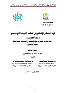 قيم التحضر الإنساني في خطاب الأنبياء لأقوامهم: دراسة تفسيرية/ نايف بن مبارك الشمري.- أسيوط: جامعة أسيوط، 1445 هـ، 2023 م (ماجستير).