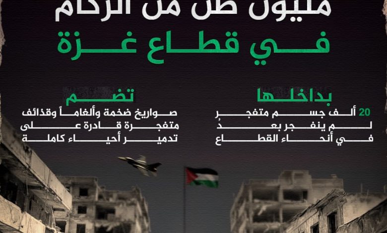 وتشير تقارير حقوقية إلى أن الحرب خلّفت ما يزيد على 20 ألف قنبلة وصاروخ لم تنفجر بعد، وسط ما يقارب 70 مليون طن من الركام الذي يملأ المدن والبلدات المهدّمة، فيما تتواصل المآسي الإنسانية بسقوط ضحايا مدنيين بسبب هذه المخلفات القاتلة.