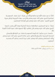 ثالثاً: ندعو علماء الأمة ودعاتها وبالأخص هيئة كبار علماء السعودية لمناصرة النبي صلى الله عليه وسلم والتنديد بهذه الجريمة ونشر سيرة النبي الكريم- صلى الله عليه وسلم في أوساط المسلمين.