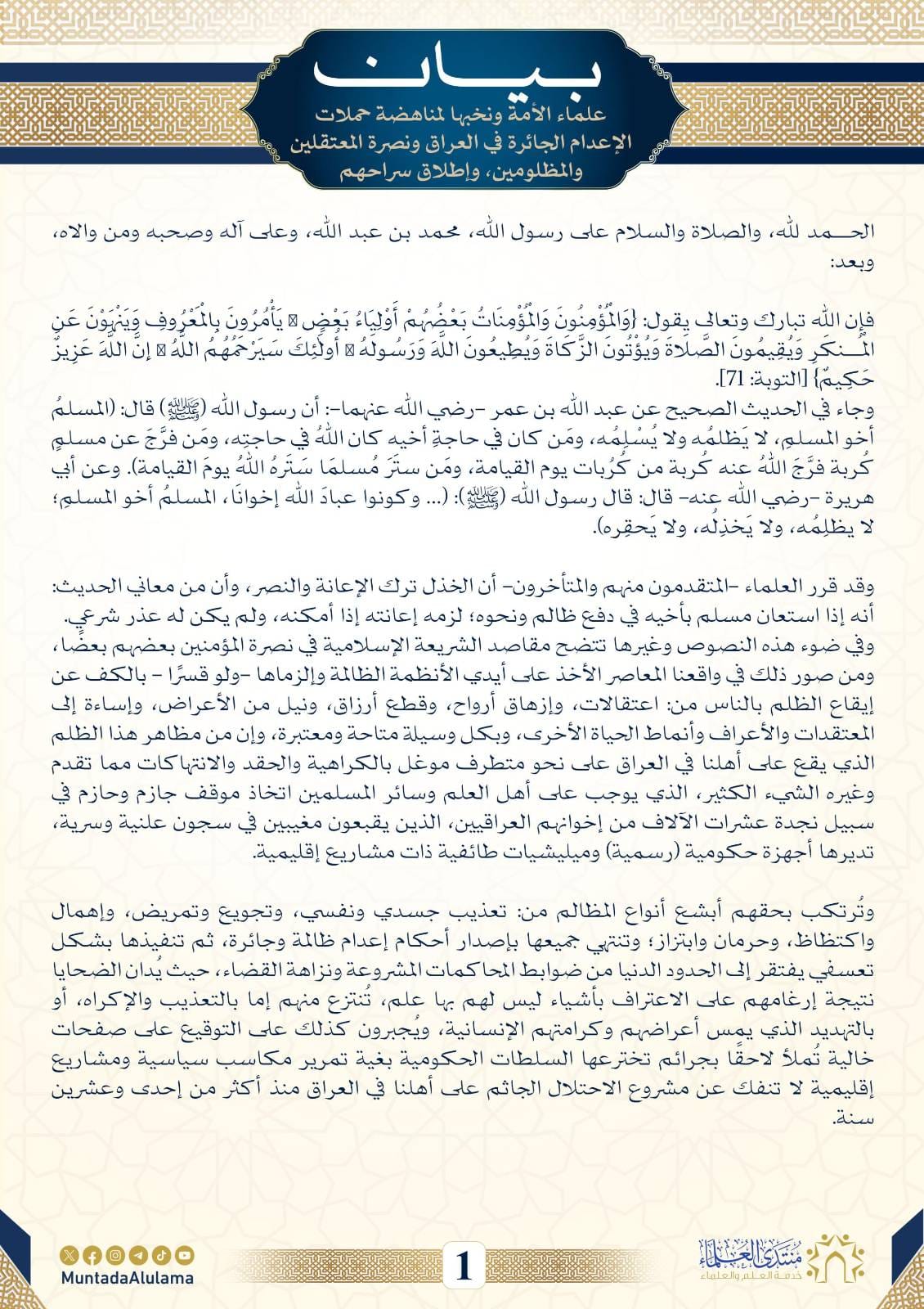 بيان علماء الأمة ونخبها لمناهضة حملات الإعدام الجائرة في العراق