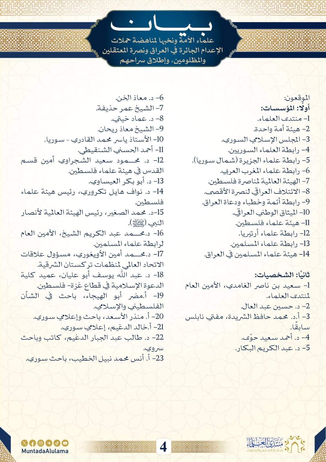 ثانيًا: الواجب على مؤسسات العلماء وهيئاتهم وشخصياتهم كل باسمه ومنصبه؛ تطبيق أمر الله عز وجل والحض عليه؛ بالأمر بالمعروف والنهي عن المنكر، وذلك بإصدار الفتاوى والبيانات التي تحرم دماء أهلنا في العراق، التي تراق بدوافع طائفية ولا سيما المعتقلين منهم الذي يُساقون إلى المشانق بالجملة، وتجريم السلطات الظالمة التي تمارس طغيانها على مرآى ومسمع الرأي العام الذي آن له أن يفيق من سباته إزاء ما يحصل في العراق منذ عقدين من الزمن.