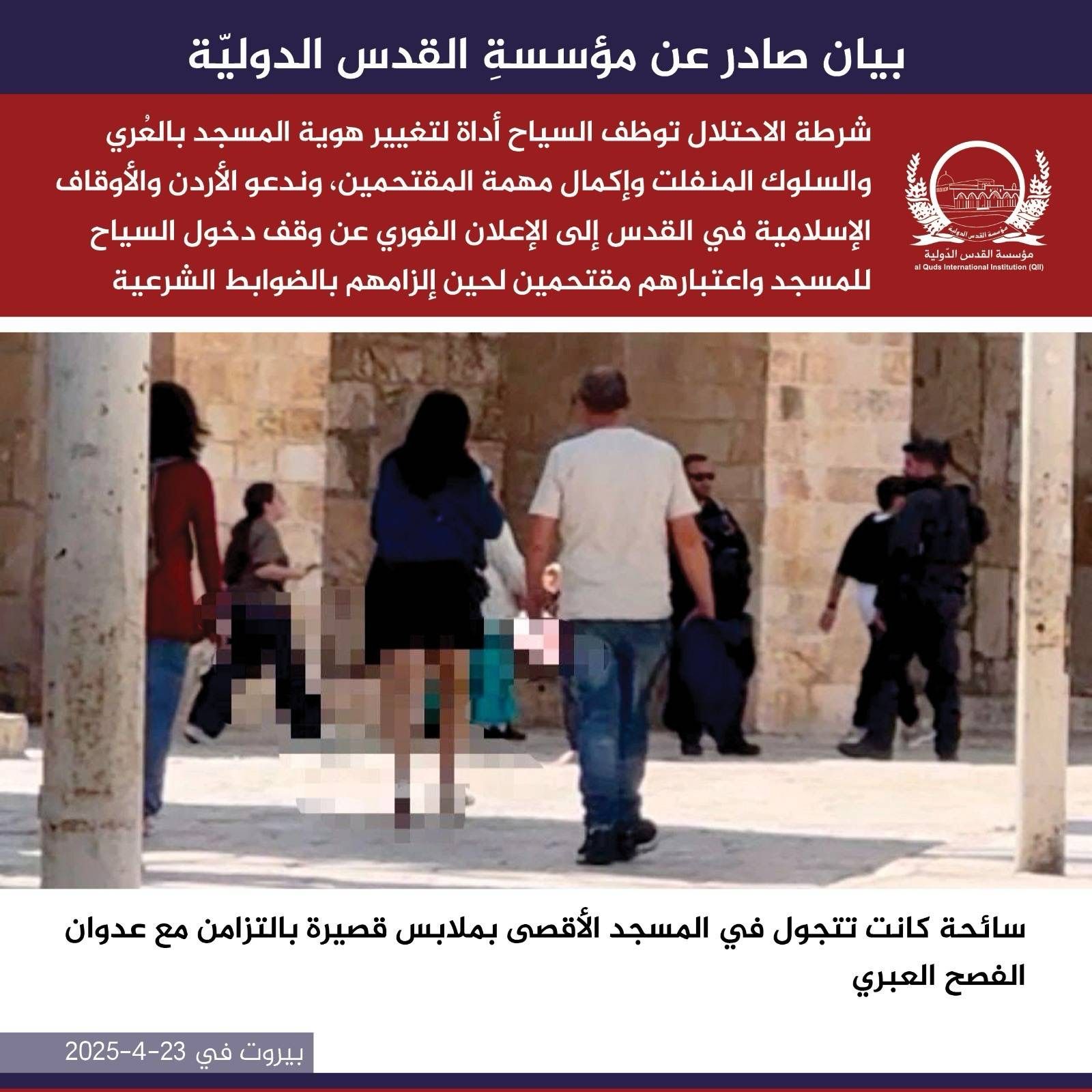 تسمح شرطة الاحتلال بدخول السائحات إلى المسجد الأقصى دون غطاء للرأس وبملابس فاضحة، مما يتعارض مع قدسية المسجد.