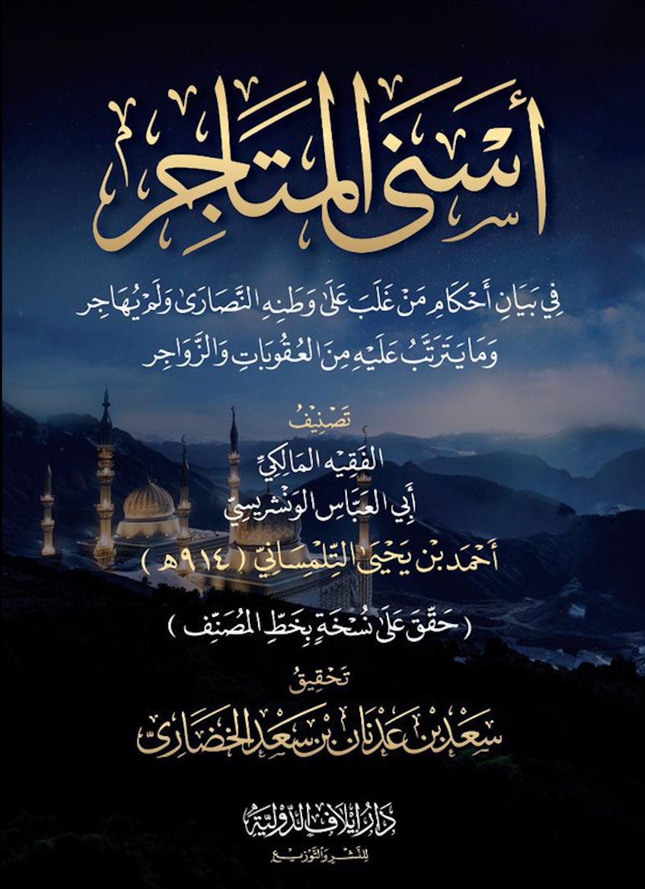 أسنى المتاجر في بيان أحكام من غَلب على وطنه النصارى ولم يهاجر وما يترتب عليه من العقوبات والزواجر/ لأبي العباس أحمد بن يحيى الونشريسي (ت 914 هـ)؛ تحقيق سعد بن عدنان الخضاري.– الكويت: دار إيلاف الدولية للنشر، 1446 هـ، 2024 م.