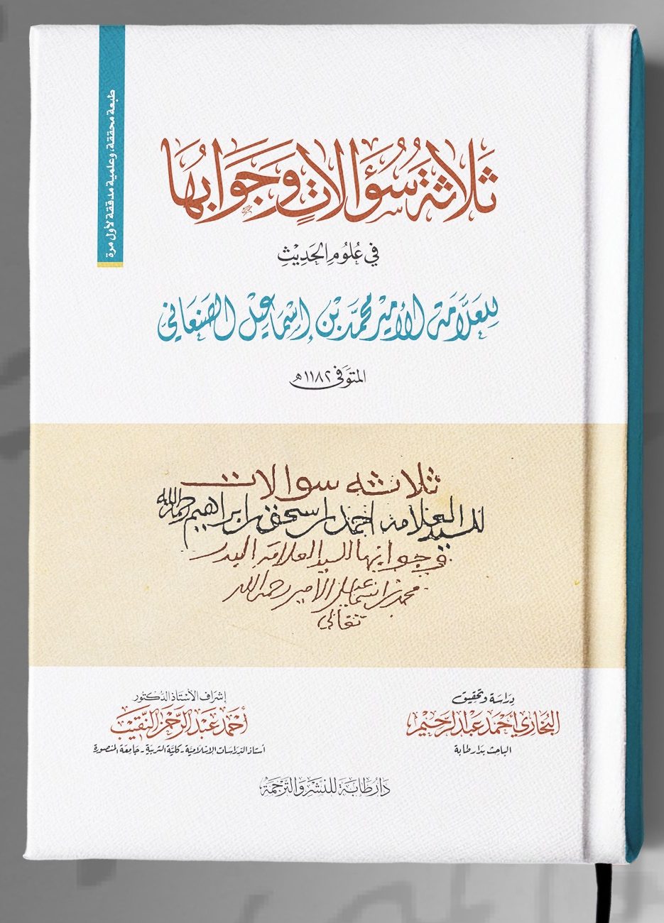 ثلاثة سؤالات وجوابها في علوم الحديث/ محمد بن إسماعيل الصنعاني (ت 1182 هـ)؛ تحقيق البخاري أحمد عبدالرحيم.– المنصورة: دار طابة للنشر، 1446 هـ، 2025 م.