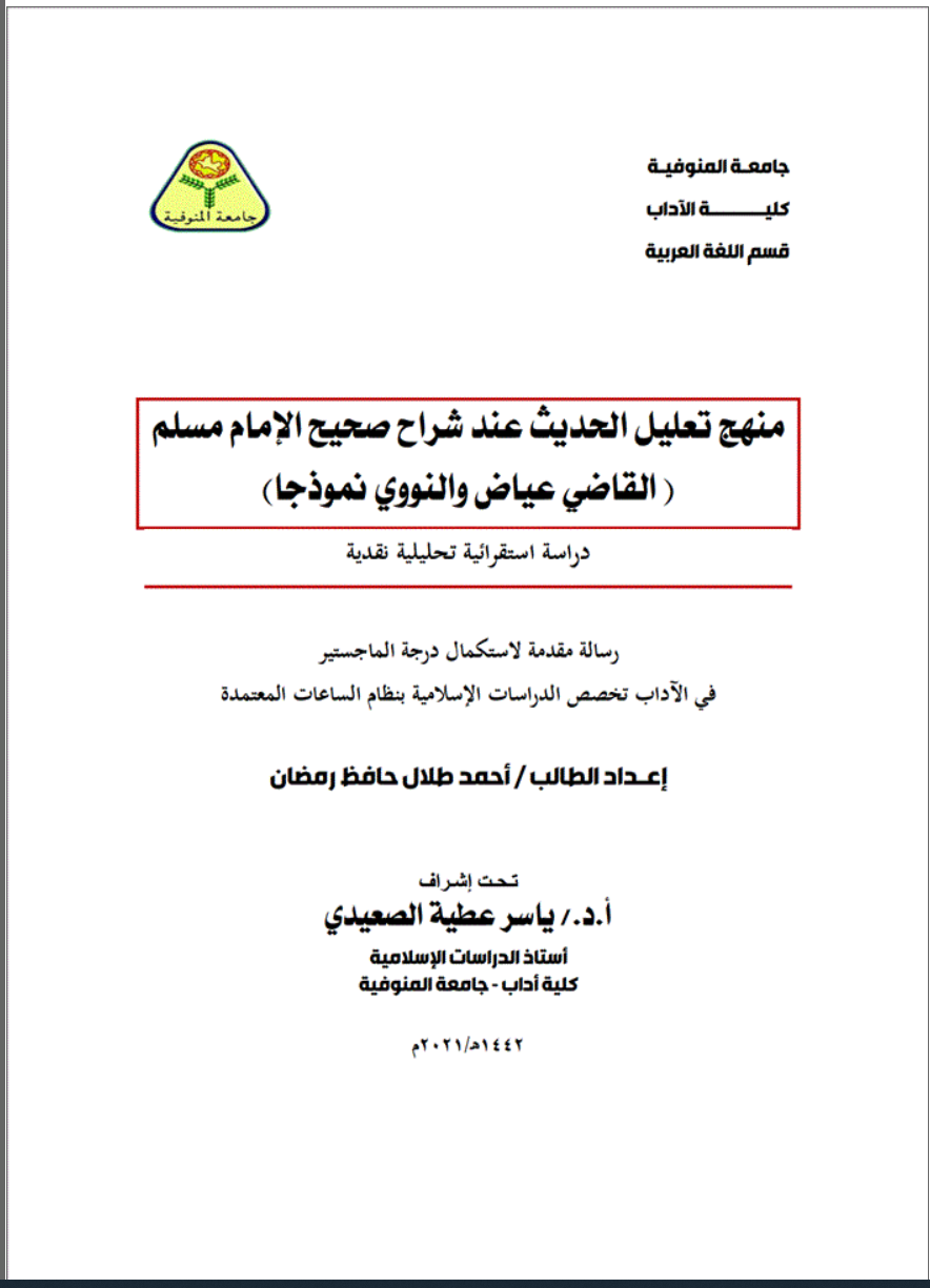 منهج تعليل الحديث عند شراح صحيح الإمام مسلم: القاضي عياض والنووي نموذجًا: دراسة استقرائية تحليلية نقدية/ أحمد طلال رمضان– المنوفية: جامعة المنوفية، 1442 هـ، 2021 م (بحث مكمل للماجستير).