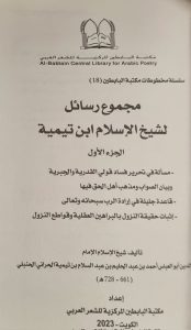 مجموع رسائل/ أحمد بن عبدالحليم بن تيمية (ت 728 هـ)؛ إعداد مكتبة البابطين المركزية للشعر العربي.- الكويت: المكتبة، 1445 هـ، 2023 م، 2 مج.