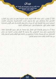 الحمد لله القائل: (وَتَعَاوَنُوا عَلَى الْبِرِّ وَالتَّقْوَى وَلا تَعَاوَنُوا عَلَى الإِثْمِ وَالْعُدْوَانِ وَاتَّقُوا اللَّهَ إِنَّ اللَّهَ شَدِيدُ الْعِقَاب) [المائدة:2]، والقائل سبحانه وتعالى: (وَإِنِ ٱسْتَنصَرُوكُمْ فِى ٱلدِّينِ فَعَلَيْكُمُ ٱلنَّصْرُ إِلَّا عَلَىٰ قَوْمٍ بَيْنَكُمْ وَبَيْنَهُم مِّيثَٰقٌ ۗ وَٱللَّهُ بِمَا تَعْمَلُونَ بَصِيرٌ)[الأنفال:72]، والصلاة على سيدنا القائل: (ما آمن بي من بات شبعان وجاره جائع إلى جنبه وهو يعلم به) أخرجه الحاكم في مستدركه، وبعد فإن الله عز وجل أوجب على المسلم نصرة أخيه المسلم وبين أن المسلمين في توادهم وتراحمهم كمثل الجسد الواحد، كما جاء ذلك عن نبيه عليه الصلاة والسلام؛ حيث قال: (مثلُ المؤمنين في تَوادِّهم ، وتَرَاحُمِهِم ، وتعاطُفِهِمْ . مثلُ الجسَدِ إذا اشتكَى منْهُ عضوٌ تدَاعَى لَهُ سائِرُ الجسَدِ بالسَّهَرِ والْحُمَّى)، متفق عليه، وإن ما يمر به إخواننا المسلمون في عموم مناطق غزة وشمالها على وجه الخصوص يضع المسلمين على المحك حيث يمتحنهم في إيمانهم وأخوتهم، كيف لا ونبينا عليه الصلاة والسلام، قد جعل ذلك من مقاييس الإيمان فقال: (ما آمن بي من بات شبعان وجاره جائع إلى جنبه وهو يعلم به) رواه الطبراني والحاكم، فإن علماء الأمة ومؤسساتها الموقعة على البيان تؤكد ما يلي: