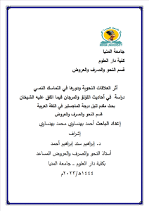 أثر العلاقات النحوية ودورها في التماسك النصي: دراسة في أحاديث اللؤلؤ والمرجان فيما اتفق عليه الشيخان/ أحمد بهنساوي محمد.- المنيا: جامعة المنيا، 1444 هـ، 2023 م (ماجستير).