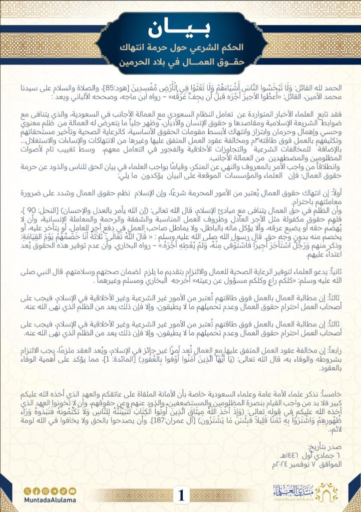 لقراءة البيان على الرابط: بيان الحكم الشرعي حول حرمة انتهاك حقوق العمال في بلاد الحرمين