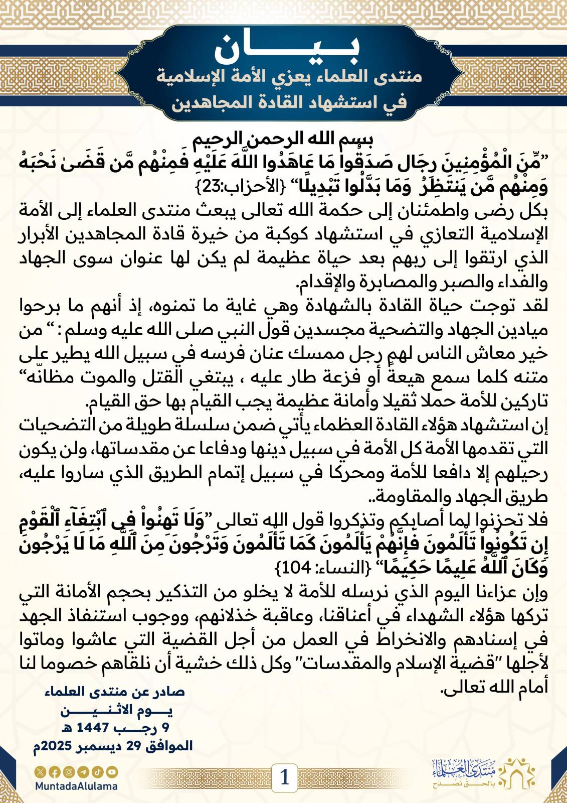 منتدى العلماء يعزي الأمة الإسلامية في استشهاد القادة المجاهدين
